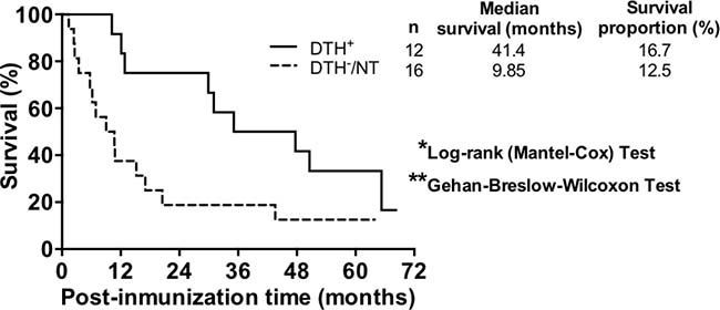 Twenty-eight patients with advanced malignant melanoma (7 stage III and 21 stage IV patients) were recruited and treated with TRIMEL-loaded DCs according to a previously described protocol [9]. Peripheral blood samples were collected from patients at each time point during the treatment, i.e., at leukapheresis, at each inoculation step (1st to 4th vaccination) and at the evaluation of DTH response to TRIMEL lysate, one month after the end of the vaccine protocol. Twelve patients displayed a positive cellular immune response to the therapy, which means a DTH reaction resulting in a skin erythema or induration with a diameter greater than or equal to 5 mm against TRIMEL-derived melanoma antigens (DTH+). This group of patients was considered as immunological responders. On other hand, eleven patients did not reacted or displayed a DTH less than 5 mm diameter after vaccination (DTH-) and five died before vaccination protocol ending without showing any signal of induration at vaccination site during the protocol, which were consequently considered as immunologically non-responders to therapy (16 patients in total) (Table 1). At the time of completion of the study (December 2013), 3 out of 12 immunological responder patients were alive (survival rate: 16.7%; median survival time: 41.4 months), and 2 out of the 16 non-immunological responders were alive (survival rate: 12.5%; median survival time: 9.85 months; Figure 1). These results are consistent with previous data obtained from over 100 stage IV melanoma patients and are in line with the immune cell response generated by TRIMEL-loaded DCs immunotherapy (post-therapy median overall survival time: 33 vs. 11 months for DTH+ and DTH– patients, respectively) [9, 14].