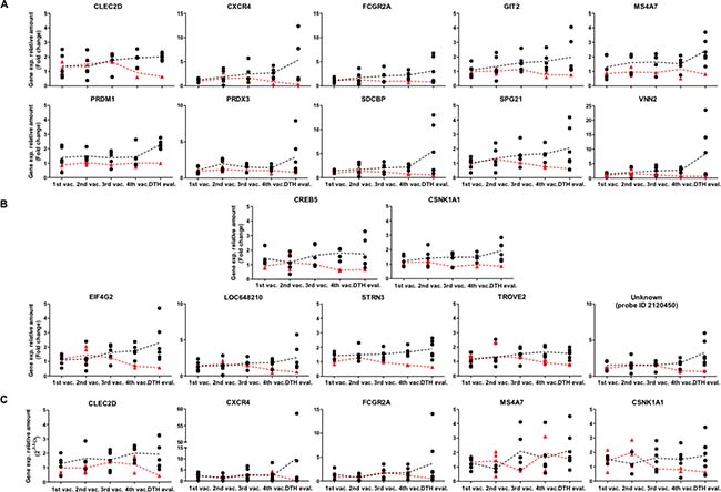 Genes were selected according to the following rules: (i) The first value in the time series is similar for both clinical responders (DTH+/ long time survivors) and non-responder (DTH-) groups; (ii) at least one of the last two values (4th vaccination and DTH evaluation) differ between the patient groups; (iii) the expression dynamics are similar within the groups; (vi) the gene expression shows significant fold changes for the clinical responders, and no significant changes for non-responder patients.