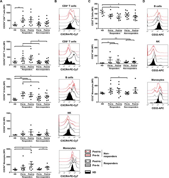 Finally, if we consider the expression levels of the three proteins evaluated—CXCR4, CD32 and CLEC2D—in each cell population, and in each patient, a clear profile related to the treatment response is still unresolved.