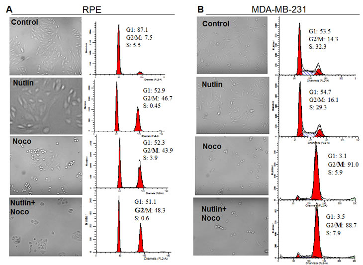 Figure 4: Nutlin-3a prevents toxic mitotic arrest by causing non-toxic G2 arrest in RPE cells. RPE (A) and MDA-MB-231 (B) cells were plated in 6-well plates at 50,000/well. Cells were either pretreated with 2.5 µM nutlin-3a or left untreated before addition of 200 nM nocodazole. After 24 hours treatment with nocodazole, cells were microphotographed (left panels), collected and analyzed by flow cytometry (right panels).