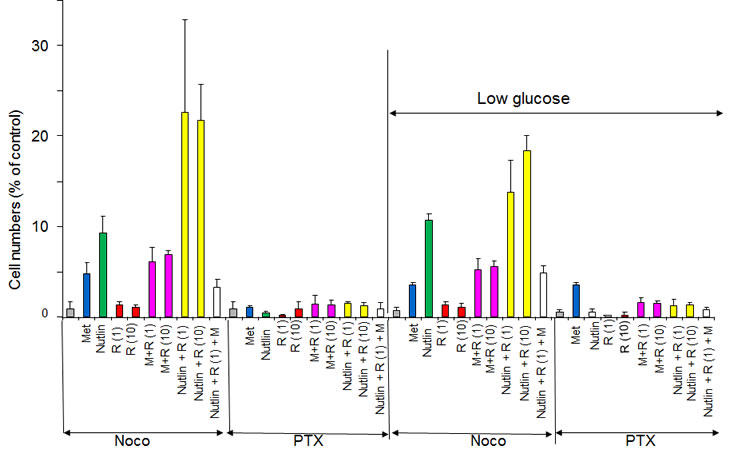 Figure 8: Protection of NKE cells from nocodazole and paclitaxel in normal glucose and low glucose. 10,000 NKE cells were plated in either 1g/L glucose or 0.5g/L glucose (low). Cells were pre-treated for 24 hrs with either 2.5 µM nutlin-3a, 1 and 10 nM rapamycin (R1 and R10), 3 mM metformin (M) alone or in combination and then were treated with either 200 nM nocodazole (Noco) or 50 nM Taxol (PTX). After 3 days, cells were washed and cultured for 6 days in fresh medium before counting.