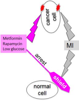 Here we demonstrated that a combination of rapamycin and metformin (R+M) caused protective G1 and G2 arrest in normal cells. Furthermore, this combination provided a long-term protection against MI in all three normal cell types. Not only did the R+M combination not protect cancer cells but, in contrast, it was toxic by itself to MDA-MB-231 cells in low glucose conditions. Low glucose levels are toxic to cancer cells, which depend on glucose as substrates for their glycolytic phenotype [65-72]. Noteworthy, metformin decreases glucose levels in the organism.