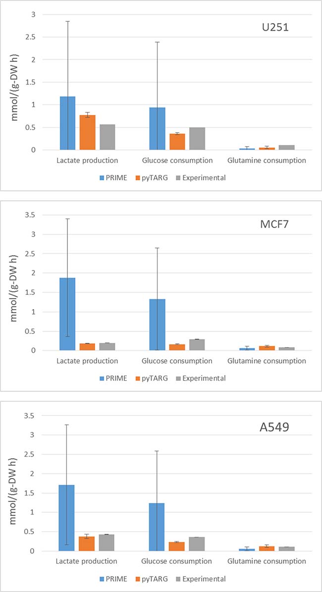 In order to assess if our constraint based modeling approach (pyTARG) can provide realistic estimations of metabolic fluxes and compare it to the existing method PRIME [13], we have selected 3 cell lines (MCF7, U251 and A549) for which RNA-seq data are available at the Human Proten Atlas (www.proteinatlas.org), and microarrays are available (as well as for all the NCI-60 cell lines) at CellMiner (https://discover.nci.nih.gov/cellminer/). The largest exchange metabolic fluxes of cancer cells are glucose and glutamine uptake and lactate secretion. We will benchmark our method based on its ability to quantify these fluxes. Experimental uptake rates for the selected cell lines are available in the literature [14]. The fluxes reported in the cited reference are given in moles per cell and GSMMs normally work with fluxes normalized by grams of biomass, therefore we need to obtain the typical cellular masses of each of the considered cell lines, which are also reported in the literature [15]. Both PRIME and pyTARG work by maximizing the biomass production rate after imposing constraints on the model (see methods). The flux distribution obtained after such maximization is just one among many possible flux distributions with the same optimal biomass production rate. In order to assess how accurately each of the methods is able to reproduce experimental flux distributions, a set of alternative optimal solutions was computed for each cell line as described previously [10], from these sets we computed averages and standard deviations for the predictors of lactate production, glucose consumption and glutamate consumption obtained using pyTARG and PRIME respectively. As it is shown in Figure 1 and Table 1, all the fluxes in all the cell lines are predicted more accurately by pyTARG, with especially large differences for lactate production and glucose consumption.