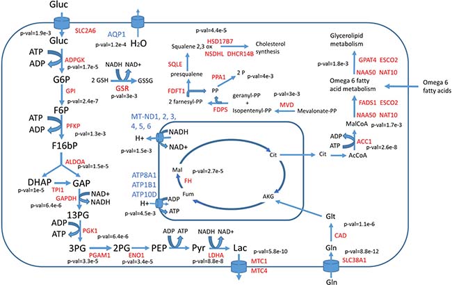 Figure 2: Main differentially used reactions between cancer cells and healthy tissues. Enzymes with higher activity in cancer cells are labeled in red, those with lower activity in cancer cells are labeled in blue. P-values showing the significance of change are given near each reaction.
