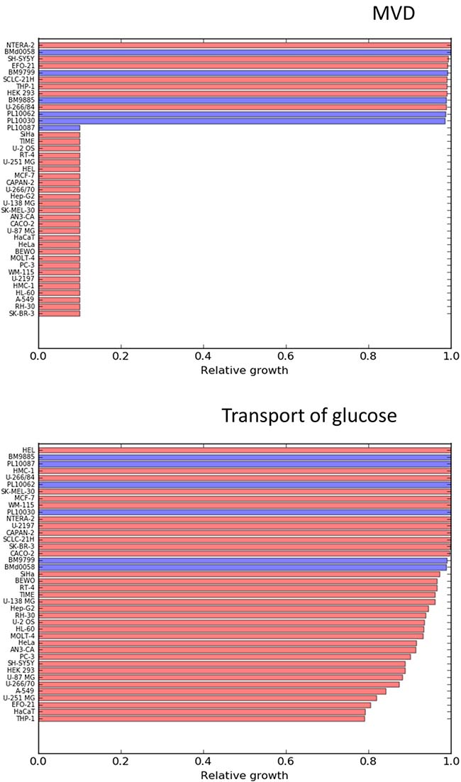Figure 4: Relative effects on cancer cell lines (red bars) and healthy mesenchymal stem cells (blue bars) after constraining to 0.1 times their initial values, the flux through MVD (mevalonate diphosphate decarboxylase) and Glucose uptake.