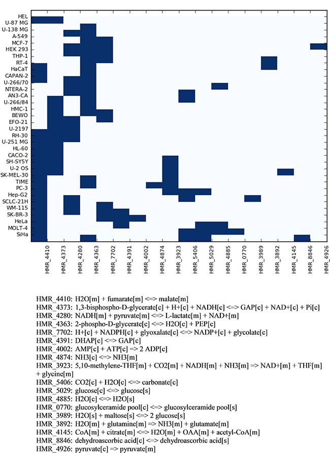 Figure 5: Combinations of reactions to be targeted in order to reduce selectively the proliferation rate of each cell line. The horizontal axis of the heatmap shows the reaction identifiers in the Human Metabolic Reaction database. The stoichiometry of each reaction is shown below.