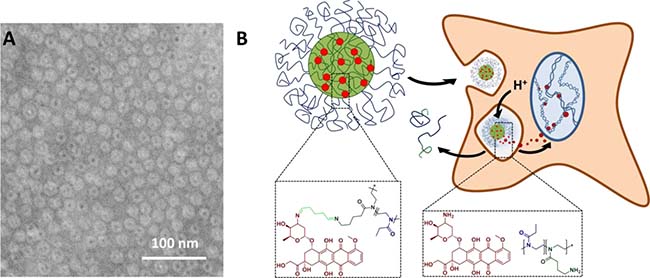 Figure 1: (A) Schematic representation of nanogels obtained from P(EtOx98-b-BocOx32) with a P(AmOx) core loaded with DOX and a P(EtOx) shell, cryo-TEM image of unlabeled DOX-nanogel in water (scale bar represents 100 nm), and (B) a schematic depiction of the drug delivery route of DOX.