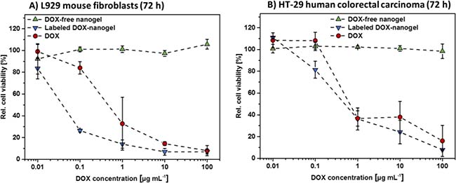 Figure 2: Cytotoxicity of DOX-free nanogels, labeled DOX-nanogels as well as free DOX were determined by XTT assay. L292 mouse fibroblasts (A) as well as HT-29 human colorectal carcinoma cells (B) were incubated for 72 h with testing substances. DOX-nanogels were used at a concentration where the amount of loaded drug resembles the amount of DOX used per data point (polymer concentration 17 times higher than DOX concentration). DOX-free nanogels were used at the same polymer concentration as DOX-nanogels. Data are expressed as mean ± SD of six determinations.