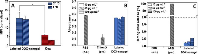 Figure 3: (A) Cellular uptake of DOX and labeled DOX-nanogels into HT-29 cells (0.01 mg mL–1) in dependence on the incubation time and temperature. Statistical differences are displayed as *p < 0.05 and according to a Student’s t-test. For amount of fluorescent cells see Supplementary Figure 12. (B) Erythrocyte aggregation of DOX-nanogels compared to PBS (negative control) and branched poly(ethylene imine) (positive control) using sheep blood of three different donors. (C) Hemolytic activity of DOX-nanogels compared to PBS (negative control) and bPEI (positive control) using sheep blood of three different donors.