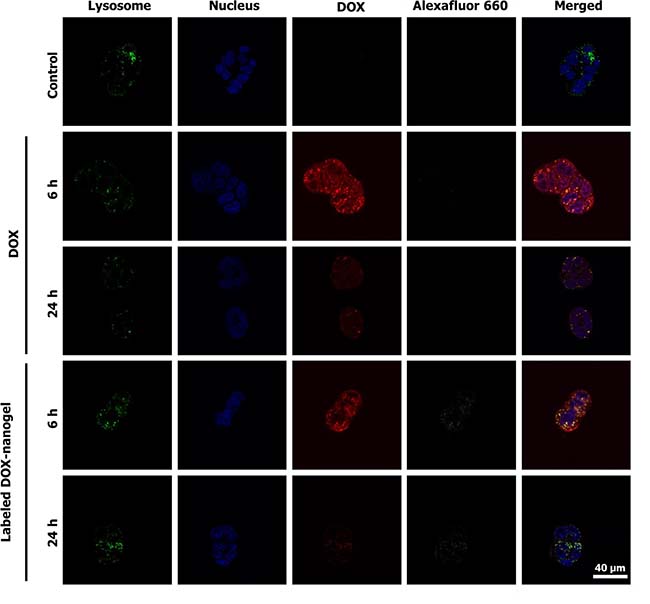 Figure 4: CLSM images of free DOX and labeled DOX-nanogels incubated with HT-29 colorectal carcinoma for 6 h or 24 h. Lysosomal cellular compartments were stained green using LysoTracker Green DND-26 and the nucleus was labeled with Hoechst 33342 (blue). The fluorescence of DOX is depicted in red and the Alexafluor label of the polymer is shown in white.