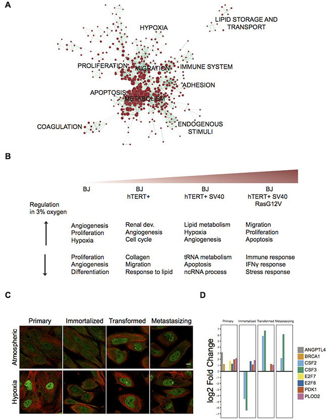 Figure 2: Functional Enrichment Analysis of differentially expressed gene sets and expression of HIF1a across the BJ model in both oxygen conditions. (A) Enrichment map showing significantly enriched GO terms among all 3,063 hDEGs. Nodes represent gene-sets and edges represent mutual overlap, grouping highly redundant gene-sets together as clusters. Here, node size corresponds to the number of genes within the gene-set and edge thickness corresponds to the number of genes that overlap between two connected gene-sets. Lists of included gene-sets are supplied in Supplementary Table 2. (B) Top three significantly enriched clusters based on the Gene Ontology domain Biological Function in DAVID, separated for up- and downregulated genes in hypoxia at each stage of the BJ model. Lists of included gene-sets are supplied in Supplementary Table 2. (C) Confocal images of the four cell lines in the model immunofluorescently stained with an antibody (HPA000907) targeting HIF1a in atmospheric oxygen and hypoxia. HIF1a expression is shown in green and microtubules (Tubulin) in red. White scale bar indicates 10 um. (D) Bar plot showing log2 Fold Change for eight hDEGs involved in enriched functions. Only genes significantly differentially expressed in each stage respectively are included in the plots (p < 0.01, log2FC > 1, TPM > 1).
