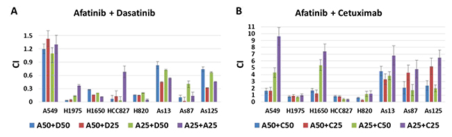 Figure 2: Combination effect of afatinib combined with either dasatinib or cetuximab in 8 NSCLC cell lines. (A) Drug interaction between afatinib and dasatinib at 4 different concentration combinations, for example, A50 + D50 indicated the combination of afatinib and dasatinib at the dosage of IC50 when treated the NSCLC cells alone. (B) Drug interaction between afatinib and cetuximab at 4 different concentration combinations, for example, A50 + C25 indicated the combination of afatinib and cetuximab at the dosage of IC50 and IC25 when treated the NSCLC cells alone, respectively. CI < 0.9, indicating the synergistic interaction between 2 drugs. Individual CI is the mean ± SD from at least 3 experiments.
