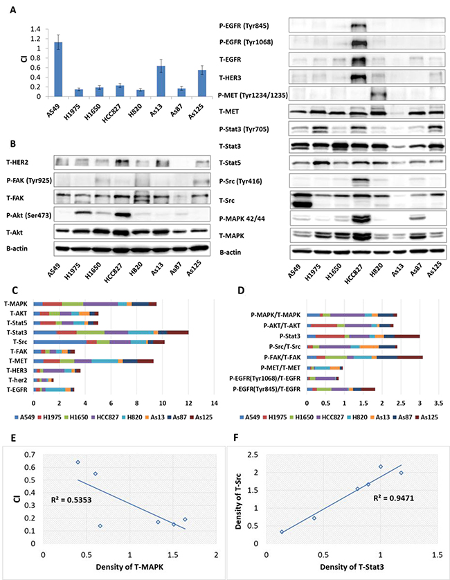 Figure 3: Baseline proteins expressions as well as combination index (CI) in NSCLC cells. (A) CI indicated the interaction between afatinib and dasatinib in 8 NSCLC cell lines. (B) Baseline expression of receptor tyrosine kinases and downstream signaling molecules determined by western blot, β-actin was used as the loading control. (C) The expression ratio of the studied proteins to β-actin quantified by ImageJ software. (D) The expression ratio of phosphorylated protein to total protein quantified by ImageJ software. (E) Significant correlation between the synergistic interaction of afatinib plus dasatinib and baseline expression of MAPK (p < 0.05). The Pearson correlation coefficient (r) was equal to 0.733. (F) Significant correlation between baseline expression level of Src and Stat3 (p < 0.001). The Pearson correlation coefficient (r) was equal to 0.972. The p-value correlation probability from r was calculated by student’s t test. Results represented the mean ± SD from at least three experiments.