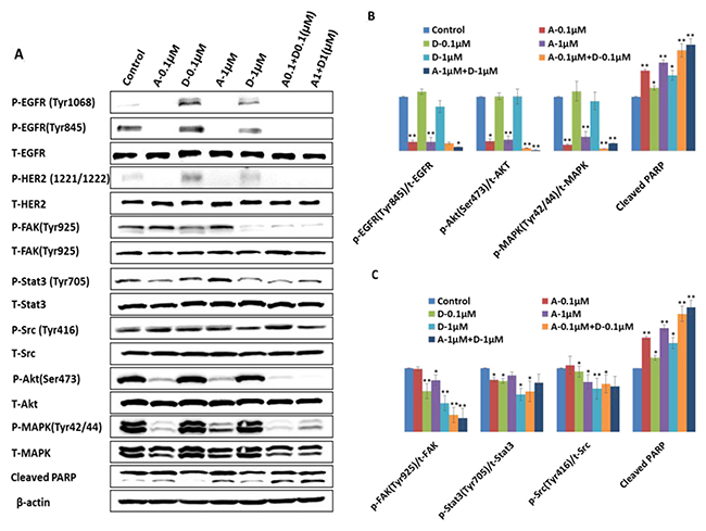 Figure 4: Different effect of afatinib, dasatinib and their combination on the targeted proteins and downstream molecules in H1650 cells. (A) Western blot analysis showed different expression level of the targeted proteins and downstream molecules upon the designated treatments. For example, A-0.1 μM indicates the treatment of afatinib at the dosage of 0.1 μM, and A0.1 + D0.1 (μM) means the combination of 0.1μM of afatinib and 0.1 μM of dasatinib. (B, C) Quantification of the ratio of phosphorylated protein to total protein by ImageJ software. The results were mean ± SD obtained from at least three experiments. P-value was calculated by student’s t test (**p < 0.01; *p < 0.05).