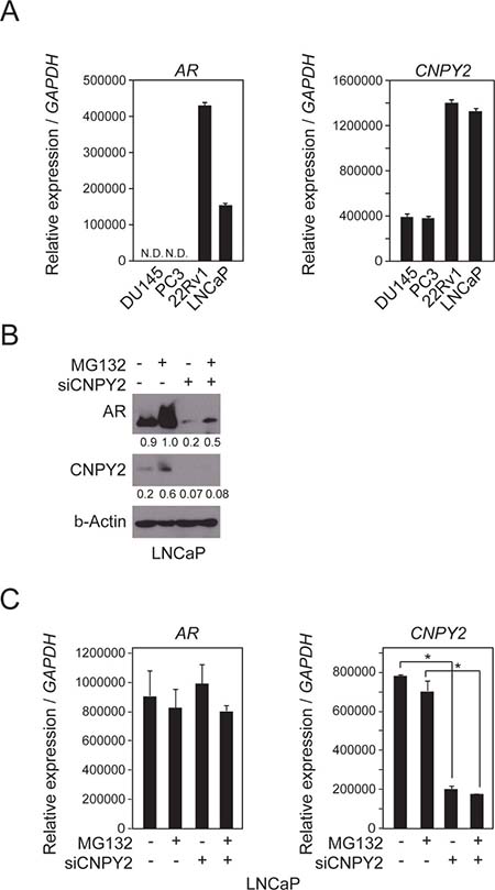 Figure 1: AR protein level is reduced by CNPY2 knockdown in PC cells. (A) Expression of CNPY2 and AR mRNAs in PC cells was measured by qPCR. Each measurement shows the average values of 3 independent measurements that were normalized to GAPDH mRNA expression levels. N.D., not detected. (B) Immunoblots of lysates from CNPY2-knockdown LNCaP cells cultured with 10 μM MG132 for 4 h. Band intensity was quantified by Adobe Photoshop. The measurements were normalized to each of β-Actin levels that are indicated at the bottom of each band. (C) mRNA expression of CNPY2-knockdown LNCaP cells cultured with 10 μM MG132 for 4 h prior to cell extraction. *P < 0.05.