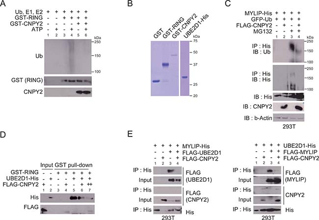 Figure 3: CNPY2 represses ubiquitination activity of MYLIP by inhibition of the interaction between MYLIP and UBE2D1. (A) In vitro ubiquitination assays were done with recombinant GST-RING protein and GST-CNPY2 protein. Ubiquitination was detected by immunoblotting using anti-ubiquitin antibody. (B) Coomassie Brilliant Blue staining with recombinant proteins for in vitro ubiquitination assay or GST pull-down assay. (C) In vivo ubiquitination assays were performed using 293T cells transfected with plasmids as indicated for 24 h. MG132 was added to the culture medium 5 h before cell extraction. Cells were lysed and subjected to immunoprecipitation using anti-His affinity beads, followed by immunoblotting with each antibody. (D) GST pull-down assays were performed with recombinant GST-RING and UBE2D1-His. Immunoprecipitated FLAG-CNPY2 was added to the reaction mixture. UBE2D1 bound to MYLIP was then detected by immunoblotting. (E) Immunoprecipitation was performed using 293T cells that were transfected with plasmids as indicated for 24 h. Immunoprecipitation using anti-His affinity beads, followed by immunoblotting with each antibody.