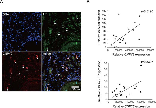 Figure 5: CNPY2 expression correlated with AR and AR target genes expression in prostate cancer patients. (A) Immunostaining using human prostate cancer tissues. DNA was stained with DAPI (blue). AR (green) and CNPY2 (red) were detected by immunostaining to demonstrate co-localization in some cells. (B) CNPY2, KLK3 and TMPRSS2 mRNA expression in prostate cancer tissues (n = 18). mRNA expression levels were quantified by qPCR. Each measurement was normalized to GAPDH mRNA levels.