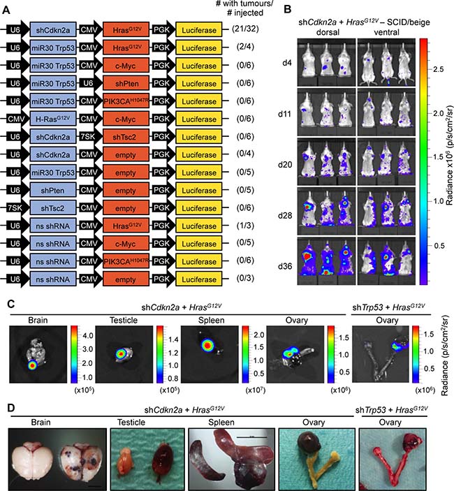 Figure 1: HrasG12V expression plus knockdown of Cdkn2a or Trp53 causes angiosarcomas in SCID/beige mice. (A) Schematic of MuLE vectors simultaneously expressing combinations of shRNAs against Cdkn2a, Trp53, Pten and Tsc2 with or without expression of HrasG12V, Myc or PIK3CAH1047R and a Luciferase reporter. (B) Bioluminescence imaging 4, 11, 20, 28 and 36 days after the injection of MuLE lentiviruses expressing shRNA against Cdkn2a together with HrasG12V into the tail veins of 4-6-week-old SCID/beige mice. Numbers of mice that developed tumours and total number of injected mice are shown for each construct. (C) Bioluminescence imaging and (D) photographs showing examples of tumour-bearing organs from shCdkn2a plus HrasG12V and shTrp53 plus HrasG12V injected animals. Scale bar: 10 mm.