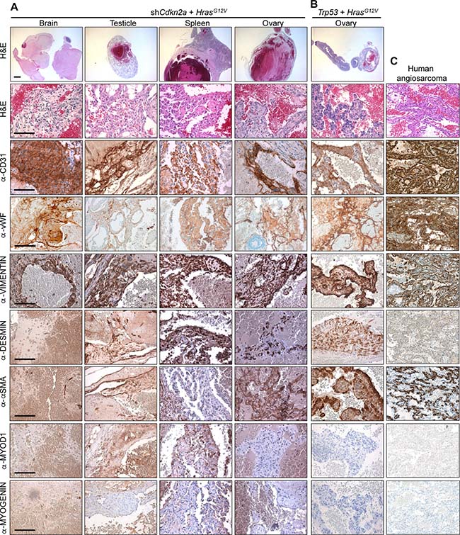 Dissections of mice revealed that the increased luciferase signals corresponded to the presence of bloody-appearing tumours in different organs (Figure 1C and 1D and Supplementary Figure 3). From 32 mice injected with shCdkn2a plus HrasG12V MuLE vectors, 21 mice developed a total of 24 tumours in various tissues including testicle (n = 9, 38%), brain (n = 7, 30%), spleen (n = 2, 8%), uterus (n = 2, 8%), ovary (n = 1, 4%), lung (n = 1, 4%), colon (n = 1, 4%) and eye (n = 1, 4%). Histological analysis of these tumours revealed poorly demarcated malignant neoplasms with hemorrhage and irregular, anastomosing vascular channels. Endothelial lining showed multilayering and intraluminal tufting with nuclear atypia, hyperchromasia, enlargement and irregularity (Supplementary Figure 3A, arrowheads). Mitotic activity was variable and back-to-back vascular channels appeared sieve-like. Atypical cells were either spindled, epitheloid or mixed. There was more solid growth in more poorly differentiated areas. Intraluminal erythrocytes were a common feature as well as large areas filled with red blood cells. Tumour cells exhibited high levels of expression of H-RAS in comparison to surrounding normal tissue, indicating that the MuLE virus is functional in vivo (Supplementary Figure 3B). Positive immunoreactivity to antibodies against the endothelial cell marker proteins CD31 and von Willebrand Factor (vWF) confirmed the endothelial differentiation of the tumour cells (Figure 2A). The lesions showed variable staining for VIMENTIN, DESMIN and SMOOTH MUSCLE ACTIN (SMA), ranging from an absence of staining to some tumours showing strong positivity (Figure 2A). None of the tumours exhibited nuclear staining for the skeletal muscle markers MYOD1 and MYOGENIN (Figure 2A). Supplementary Figure 4 shows positive and negative control stainings for the different antibodies employed throughout this study. Tumours that arose in Trp53 knockdown plus oncogenic HrasG12V injected mice displayed an identical histological appearance and immunohistochemical staining profile to tumours in Cdkn2a knockdown plus oncogenic HrasG12V injected mice (Figure 2B). In summary, these histological and molecular features are consistent with a diagnosis of angiosarcoma. Indeed, analyses of three human angiosarcomas revealed that they have a simlar histological appearance and exhibit a similar pattern of immunoreactivity to the mouse tumours (Figure 2C). We conclude that we have developed a rapid autochthonous mouse model of angiosarcoma that is trackable via live animal imaging and that reflects the frequent genetic alterations that arise in human angiosarcoma tumours.