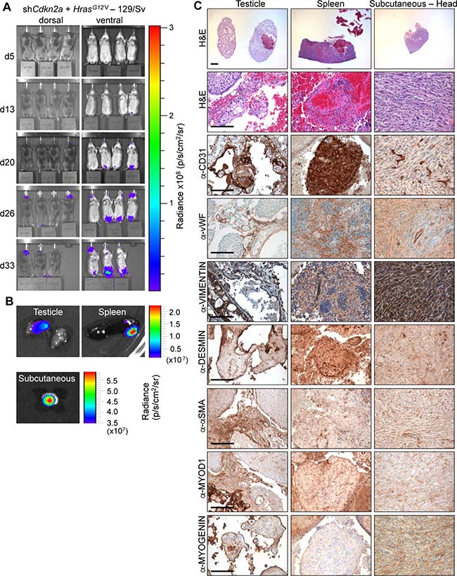 Figure 3: HrasG12V expression plus knockdown of Cdkn2a causes angiosarcomas and undifferentiated pleomorphic sarcomas in 129Sv mice. (A) Bioluminescence imaging 5, 13, 20, 26 and 33 days after the injection of MuLE lentiviruses expressing shRNA against Cdkn2a together with HrasG12V into the tail veins of 4-6-week-old 129/Sv mice. (B) Bioluminescence imaging showing examples of tumour-bearing organs.. (C) H&E and immunohistochemical stainings using the indicated antibodies. Low magnification scale bars: 1000 μm and high magnification scale bars: 100 μm.
