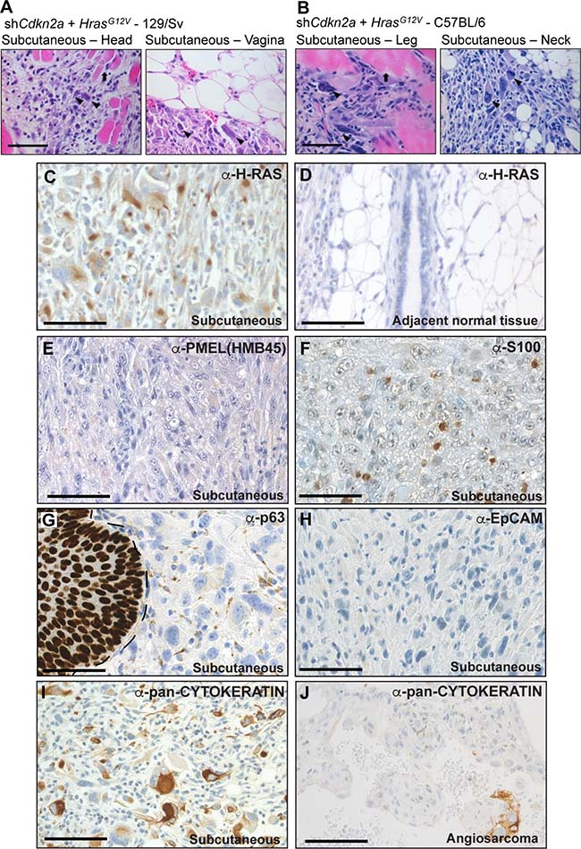 To investigate sarcoma formation in mouse backgrounds that are more commonly utilised for biomedical research we next employed 129/Sv mice. Intraveneous injections of shCdkn2a plus HrasG12V MuLE viruses in 129/Sv mice (n = 8) caused a strong luciferase signal increase and the development of multiple tumours with 100% penetrance within 4 weeks (Figure 3A and 3B, Supplementary Figure 6A). Bloody-appearing tumours were observed in testicles of 75% of male mice (n = 3) and in uteri (n = 2) and ovaries (n = 2) of 50% of female mice. 25% of mice carried lesions in the spleen (n = 2), and 13% in lung (n = 1) and brain (n = 1), similar to results in SCID/beige mice. However, all female mice (n = 4) additionally developed subcutaneous tumours (n = 5) that were located in the head and neck region and close to the subcutis of the vulva. These tumours were solid and white in appearance (Figure 3C, last column). Neither the sub-cutaneous location, nor the gross morphological appearance, were ever seen in tumours in SCID/beige or Fox Chase CB17 mice. While all of the bloody-appearing tumours exhibited an identical histological appearance and pattern of immunoreactivity similar to tumours that arose in SCID/beige mice (Figure 3C, Supplementary Figure 6B), classifying them as angiosarcomas, the subcutaneous tumours exhibited a completely different histology and immunohistochemical staining profile. These tumours contained cells with rhabdoid features; i.e., large polygonal cells with gigantic bizarre nuclei (Figure 4A; arrowheads), abundant, deeply eosinophilic cytoplasm in a tadpole- or racquet shape and growing in a storiform pattern. Nuclei displayed high mitotic indices, irregular nuclear membranes, and eosinophilic cytoplasmic inclusions. These tumors showed necrotic regions, acute inflammatory responses and were highly invasive, infiltrating surrounding tissues including muscle and fat (Figure 4A, arrows). The absence of apparent features of any definable cell lineage is suggestive of a diagnosis of undifferentiated pleomorphic sarcoma (UPS). Indeed, while these tumours showed high levels of H-RAS expression in comparison to adjacent normal tissue (Figure 4C, 4D) and were immunoreactive for the common mesenchymal marker VIMENTIN, the tumour cells did not stain for lineage markers including CD31, vWF, DESMIN, SMA, MYOD1 or MYOGENIN (Figure 3C, last column). Given the subcutaneous location of these tumours, we further investigated whether the tumours might potentially represent sarcomatoid variants of malignancies derived from a skin cell. Tumours in 129/Sv mice stained negatively for the melanoma marker protein PMEL (the HMB45 antigen) (Figure 4E). Melanomas, as well as other types of neural lineage-derived tumours are typically diffusely positive for S100 and PMEL. The majority of tumour cells in tumours in 129/Sv mice were negative for S100 but some scattered cells within the tumour displayed positive immunoreactivity for S100 (Figure 4F). Since macrophages also stain positively for S100, it is likely that this staining is due to the presence of inflammatory cells. Tumour cells in human sarcomatoid squamous cell carcinomas typically exhibit nuclear immunoreactivity for p63 [29]. While normal skin showed strong nuclear p63 immunoreactivity as an internal positive control, only a small number of scattered cells in tumours in 129/Sv mice displayed weak cytoplasmic staining for p63 (Figure 4G), arguing against a diagnosis of sarcomatoid squamous cell carcinoma. Tumours were also completely negative for the epithelial marker EpCAM (Figure 4H), but scattered cells within the 129/Sv subcutaneous tumours (Figure 4I), as well as rare cells in angiosarcomas in SCID/beige mice (Figure 4J), reacted with a pan-CYTOKERATIN antibody, another epithelial marker. However, since human sarcomas, including UPS and angiosarcoma, can contain cells that are immunoreactive for pan-CYTOKERATIN caution should be taken in interpreting this staining as providing strong evidence of epithelial origin [30]. Positive control stainings of all of these antibodies are shown in Supplementary Figure 4.