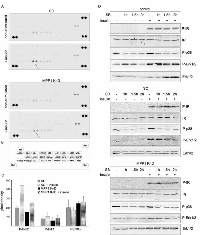 Figure 2: Only the Erk1/2 signaling cascade downstream of the activated IR is interrupted in MPP1 KnD cells. (A) SC (top) and MPP1 KnD cells (bottom) were treated or not treated, with insulin [1 μg/ml] for 10 min, after which whole-cell extracts were subjected to kinase activation analysis. (B) Schematic representation of activated kinases membrane spots. (C) Quantification of the relative phosphorylation levels of Erk1, Erk2 and p38α in SC and MPP1 KnD cells normalized to reference spots (marked as ʻRef’) (average ± S.D. from four independent measurements). (D) Control, SC and MPP1 KnD cells were pretreated with SB202190 [10 μM] for 1, 1.5 and 2 h before insulin treatment for 10 min. Whole-cell extracts were subjected to Western Blot analysis and probed with the indicated antibodies.