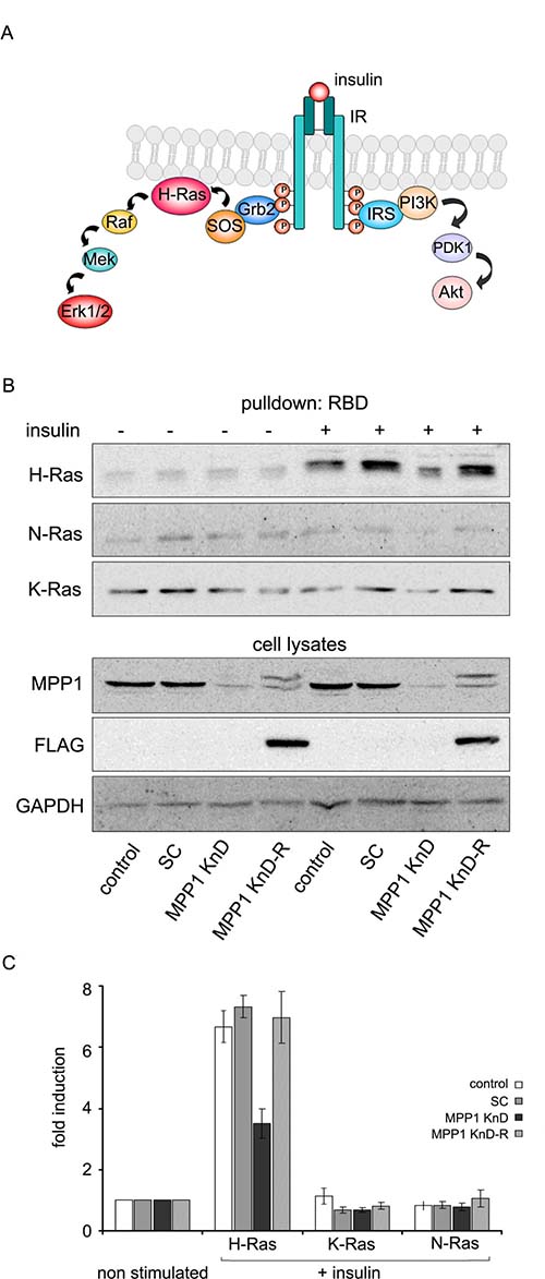 Figure 3: Signal transduction from activated IR is arrested at the level of H-Ras. (A) Schematic diagram of two alternative signaling pathways downstream of activated IR. (B) Control, SC, MPP1 KnD and MPP1 KnD-R (KnD cells transfected with rescue vector encoding FLAG-tagged MPP1) cells were treated with insulin [1 μg/ml] for 5 min, after which 600 μg of total protein from whole-cell extracts were subjected to pull-down of active H, K and N-Ras-GTP using GST-Raf1-RBD. Additionally, the same whole-cell extracts were probed with the indicated antibodies. The double band and positive reactivity with anti-FLAG antibodies comes from expression of FLAG-tagged MPP1 from rescue mutant. Note: due to close values of mol. wt. data for GAPDH and FLAG are coming from the same samples but from different gels. (C) Quantification of the levels of activated H-, K- and N-Ras-GTP normalized to GAPDH levels (average ± S.D. from three independent measurements). RBD–Ras binding domain, WB–Western blot.