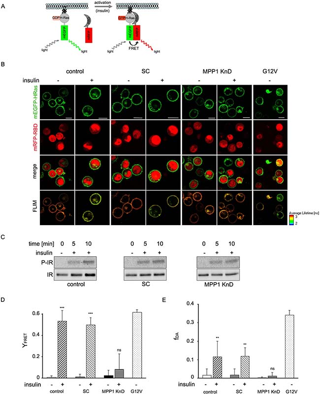 To confirm changes in H-Ras activity we analyzed direct interactions of H-Ras with its effector molecule, Raf, via another methods. First we analyzed membrane recruitment of cRaf to activated H-Ras (Figure 4A). We observed change of localization of RBD domain of cRaf towards PM upon insulin treatment in control and SC cells while in KnD cells no change was detected (Figure 4A). Detailed analysis of localization revealed colocalization with H-Ras (Figure 4B). Additionally we performed Förster resonance energy transfer (FRET) between mEGFP-HRas (donor) and mRFP-RBD from cRaf (acceptor) overexpressed in control, SC and MPP1 KnD cells treated with insulin (Figure 5A), to follow direct interaction between H-Ras and RBD. We also used the mEGFP-labeled constitutively active H-Ras mutant (G12V), which has a high affinity for RBD [32], as a positive control of H-Ras activity. FRET provides information about direct interaction between molecules, as its efficiency highly depends on the distance between them and is observed only at nanometer-range proximity [33]. One of the methods to quantify FRET efficiency is the measurement of the fluorescence-lifetime of a donor, in the presence or absence of acceptor, by using fluorescence lifetime microscopy (FLIM). This method allows the resolution of both the fractional contribution and fluorescence lifetimes of interacting and non-interacting species. Therefore, to examine the interaction between activated H-Ras and RBD, we used FLIM-FRET methodology. Cellular localization and fluorescence lifetimes of both donors only (mEGFP-HRas and G12V) were determined (Supplementary Figure 3). The obtained lifetime values were at 2.50 ± 0.01 and 2.47 ± 0.02 ns respectively. FLIM-FRET images showed an increased FRET after insulin stimulation of both controls, observed as significantly decreased mean mEGFP-HRas fluorescence-lifetimes, while almost no lifetime-change was observed for insulin-treated MPP1 KnD cells (Figure 5B). To confirm IR activation, samples were collected and analyzed by Western Blot. All cell-lines showed comparable IR phosphorylation levels (Figure 5C), indicating that all cells were activated. After fitting to a bi-exponential decay model, FRET efficiencies were calculated for each donor-acceptor pair relative to the donor only. Apparent FRET efficiency (YFRET) markedly increased for control and SC cells treated with insulin (0.52 ± 0.1, 0.49 ± 0.08 respectively), reaching the level comparable with constitutively active G12V (0.53 ± 0.03), while no significant increase in YFRET was observed for insulin-treated MPP1 KnD cells (0.08 ± 0.14) (Figure 5D). Moreover, the contribution of the bound donor-acceptor pair (fDA) for both controls increased after addition of insulin (0.12 ± 0.08 control, 0.12 ± 0.05 SC) while, for MPP1 KnD, there was no substantial increase in the binding fraction (0.01 ± 0.02) (Figure 5E). However, the contribution of the binding fraction detected for controls was relatively low, compared to G12V (0.34 ± 0.03). This can be explained by the fact that only a fraction of mEGFP-HRas was activated in the insulin-treated cells while majority of G12V is constitutively active. Binding fraction reflects more precisely the actual situation as it dissects the contribution of distinct fluorescence species. All the data, including mean fluorescence lifetimes and the χ2 value, which describes parameters of fitting, are summarized in Supplementary Table 1.