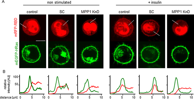 Figure 4: Localization of mEGFP-HRas and mRFP-RBD in non-stimulated and insulin treated cells. (A) Representative images, scale bar 10 um, (B) Relative fluorescence intensity profiles.
