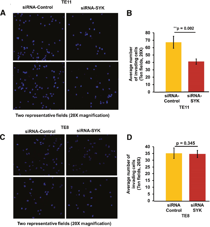 Post 36 hours of siRNA transfection, cells were trypsinized and 5×104 cells seeded onto Biocoat matrigel invasion chambers (catalog # 354480, BD Biosciences) in high glucose DMEM containing 2% FBS. DMEM high glucose medium with 10% FBS was added in the lower chamber as chemo attractant. The cells were allowed to invade the matrigel membrane overnight. The membranes were stained with DAPI (Invitrogen) after carefully removing the cells from the inner side and the number of cells that had invaded the matrigel and membrane was counted in 10 randomly selected fields at 20X magnification under fluorescence microscope using blue/cyan filter. Cells were counted using ImageJ and average number of cells in siRNA- control and siRNA-SYK in TE11 and TE8 lines were calculated separately to evaluate the differences in invasion between siRNA-control and siRNA-SYK transfected TE11 and TE8 cells.