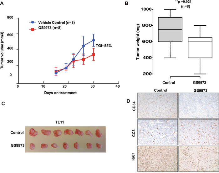 Figure 6: Effect of SYK inhibitor entospletinib/GS9973 on growth of subcutaneous xenograft of TE11 cell line. (A) Tumor growth in mice untreated or treated with SYK inhibitor entospletinib. (B) Box plot showing tumor weight in treatment and control group. (C) Representative tumors from four mice untreated or treated with entospletinib/GS9973. (D) Representative image of immunohistochemistry using anti CD34, Ki67 and cleaved caspase 3 on control and treated tumor tissue sections.
