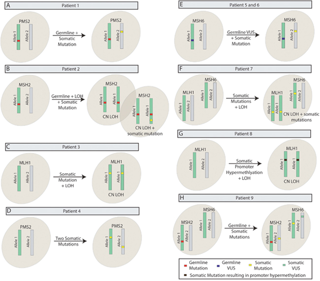 Figure 2: Representative patient scenarios observed since the launch of TumorNext-Lynch-MMR. (A) Germline mutation + somatic mutation as the second hit, (B) Germline mutation + LOH as second hit, plus somatic mutation, (C) Somatic mutation + LOH, (D) Double somatic mutations, (E) Germline VUS + somatic mutation, (F) Multiple somatic mutations + LOH, (G) Somatic mutation leading to promoter hypermethylation + LOH, (H) Germline mutation + multiple somatic mutations.