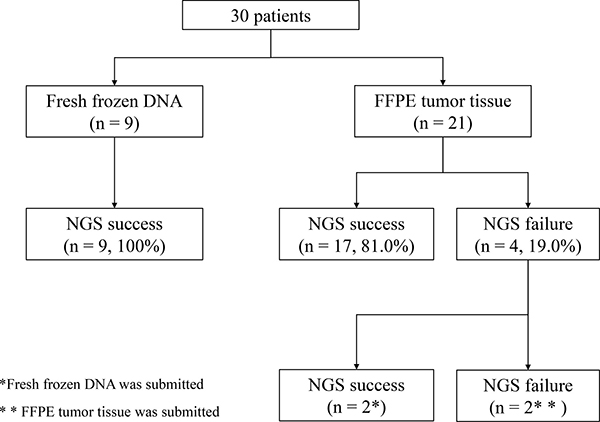 An NGS-based multiplex assay (OncoPrimeTM) covers complete coding exons of 215 cancer-related genes and rearrangements in 17 frequently rearranged genes (Supplementary Table 1) [13, 19]. DNA extracted from archived FFPE tissue samples or fresh frozen tissue samples was used for this assay. NGS was performed in a CLIA-certified laboratory using Illumina HiSeq 2500 by EA Genomics (Morrisville, North Carolina, United States).