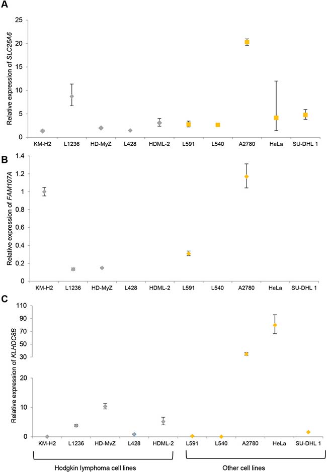 Figure 2: (A) SLC26A6 (B) FAM107A (C) KLHDC8B expression in established cell lines. Hodgkin lymphoma cell lines: KM-H2, L1236, HD-MyZ, L428, HDML-2. Each cell line was assayed in triplicate and normalized against GAPDH expression. Expression of FAM107A in L428, HDML-2, L540, HeLa and SU-DHL1 was below the limit of detection. Data are shown as mean (± standard error of the mean).