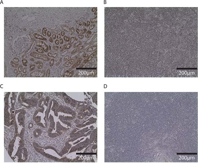 Figure 3: Immunohistochemistry of SLC26A6 and FAM107A in other tissues and Hodgkin lymphoma node biopsy. Photos (20×) of representative examples illustrating SLC26A6 staining of renal biopsy (A) and Hodgkin node (B); FAM107A staining of colorectal cancer tissue (C) and Hodgkin node (D). Immunostaining indicated by DAB, counterstained with haematoxylin.