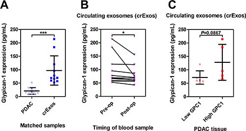 Figure 2: Circulating exosomal Glypican-1 (GPC1) is a marker of PDAC disease burden. (A) In matched samples, Glypican-1 (GPC1) is enriched in circulating exosomes (crExos; n = 11) compared to their source PDAC tissues (n = 11; ***P < 0.001). (B) The crExos GPC1 levels were found to decrease post-operatively after surgical resection when compared to matched pre-operative samples from the same patients (n = 11 vs. 11; *P < 0.05). (C) PDAC tissues with high GPC1 expression did not have crExos with higher GPC1 levels in matched samples.