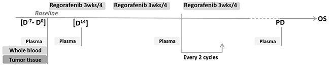 Taking into account the relatively narrow efficacy/toxicity ratio for regorafenib in aCRC, and the lack of available biomarkers, the initial purpose of the clinical trial RegARd-C (NCT01929616) was to detect and analyze tumors unlikely to benefit from regorafenib using combined early metabolic assessment of response and modern biological armamentarium. The sample collection in RegARd-C is depicted in Figure 1.