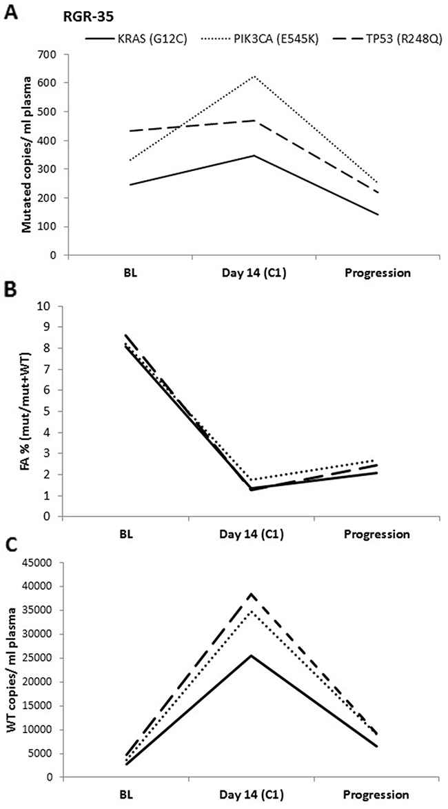 Another important issue raised during our study was the choice of data representation for ddPCR. cfDNA includes both mutant and wild-type DNA derived from the tumor and from non-tumor tissue. Often, ddPCR data as well as targeted sequencing data are represented as FA or as the ratio of mutated alleles over wild-type alleles plus mutated alleles, using the wild-type copies as an intra-patient control for exclusion of poor sample quality or poor sample handling during cfDNA extraction. This data representation would be correct and efficient as long as the wild-type copies are constant over time. Due to the choice of sample collection and cfDNA analysis at 14 days of treatment in our study, it became clear that the treatment may significantly affect the number of wild-type copies through toxicity on normal tissues, introducing a possible bias in the FA variable potentially affecting hugely the molecular monitoring of the patients disease. It is generally believed that cfDNA is released into the circulation by apoptosis and necrosis. Regorafenib is known to be toxic for various tissues including the gastrointestinal tract, skin, and liver. [20] It is reasonable to assume that damaged tissues could be the source of a massive release of wild-type cfDNA in the blood circulation. This deserves further investigation. Since exercise, trauma, pregnancy etc. also affect the release of DNA in the bloodstream, caution should be taken when considering non-mutated cfDNA as a standard for data representation [21, 22]. Pallisgaard and colleagues recently suggested to use an external standardization method by spiking the plasma samples with quantifiable non-human DNA fragments to control for loss of DNA during sample preparation [23]. This proposal should be considered when measuring mutated copies over time.
