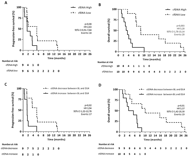 Figure 5: Kaplan-Meier curves for OS and PFS in aCRC patients receiving regorafenib therapy. Survival curves are represented according to the level of (A, B) cfDNA in plasma at baseline for OS and PFS, respectively and according to (C, D) the increase or decrease of ctDNA levels between baseline (BL) and 14 days after the start of regorafenib therapy (D14). Two patients out of 20 were not included in the PFS analysis due to missing information on clinical progression. For ctDNA analysis, another patient was excluded due to a poor quality blood sample at C1.