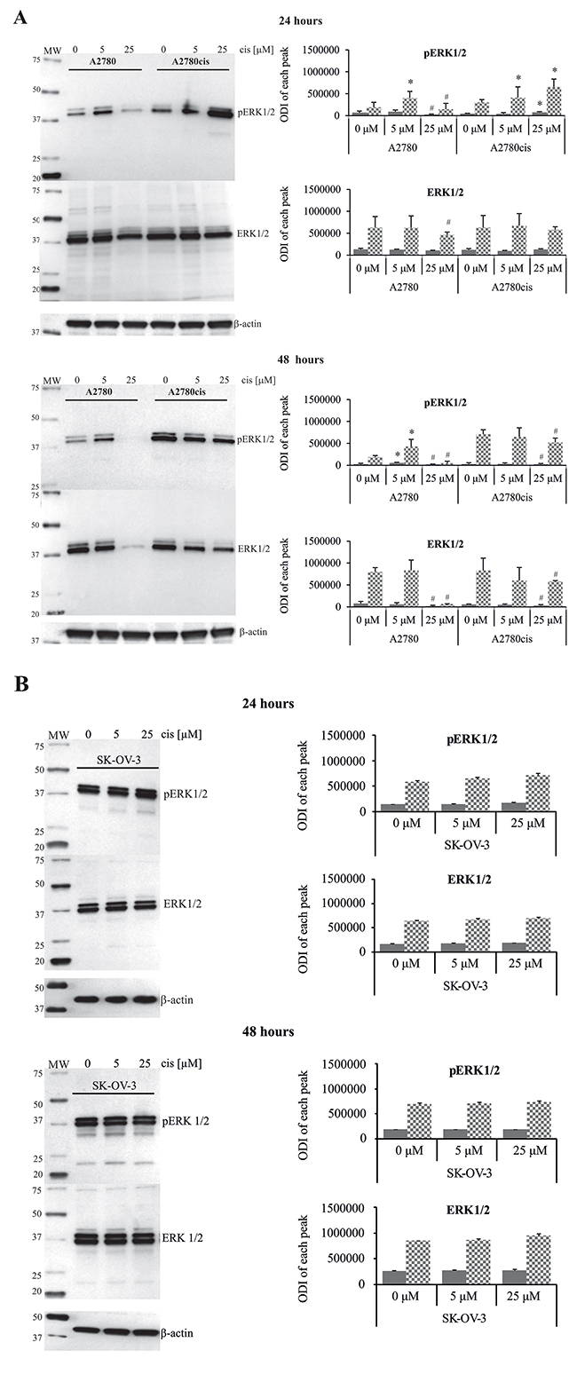 Figure 2: Effect of cisplatin on the total amount and phosphorylation state of ERK1/2 in A2780, A2780cis and SK-OV-3 cells. A2780 and A2780cis (A), as well as SK-OV-3 (B) cells were treated with cisplatin at concentrations of 5 μM or 25 μM for 24 or 48 hours or left untreated. Representative immunoblots of the ERK1/2 protein level and their phosphorylation are presented. Bands were quantified by densitometric analysis and data are presented as the optical density intensity (ODI) of the area under each band’s peak ± SD from 5 independent experiments. ERK1 – gray column and ERK2 - checkered column. *Statistically significant increase: cisplatin treated cells vs. untreated cells, p=0.043; #Statistically significant decrease: cisplatin treated cells vs. untreated cells, p=0.043 (Wilcoxon’s signed-rank test).