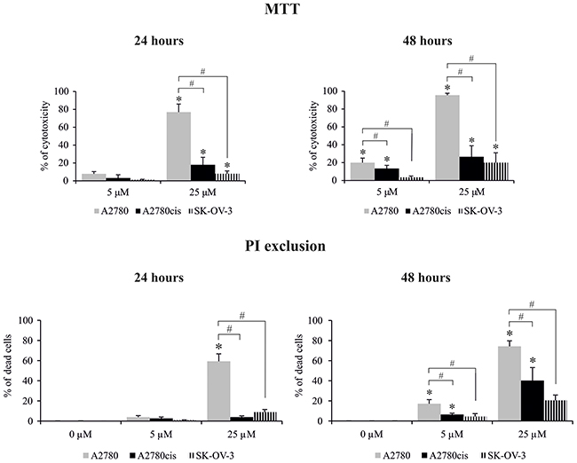 Figure 3: Effect of cisplatin on the viability of A2780, A2780cis and SK-OV-3 cells. Cells were treated with cisplatin at concentrations of 5 μM or 25 μM for 24 or 48 hours or they were left untreated. The viability of cells was determined with the MTT assay and data are presented as the percentage of cytotoxicity ± SD from 6 independent experiments or with PI exclusion assay, and data are presented as percentage of dead cells ± SD from 4 independent experiments. Statistical significance: *cisplatin treated cells vs. untreated cells, p≤0.01 (paired t-test). #A2780 vs. A2780cis and SK-OV-3 cells, p≤0.01 (unpaired t-test).