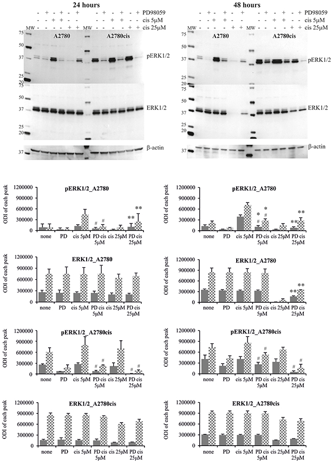 Figure 5: Phosphorylation of ERK1/2 in A2780 and A2780cis cells treated with MEK1/2 inhibitor and cisplatin. Cells were first treated with 50 μM PD98059 for 1 hour and then cultured with cisplatin at the concentrations of 5 μM or 25 μM for 24 or 48 hours or left untreated. Representative immunoblots of the ERK1/2 protein level and their phosphorylation are presented. Bands were quantified by densitometric analysis and data are presented as the optical density intensity (ODI) of the area under each band’s peak ± SD from 5 independent experiments. ERK1 – gray column and ERK2 - checkered column. Statistically significant decrease: #cisplatin + PD98059 vs. cisplatin, p≤0.05; Statistically significant increase: *cisplatin + PD98059 vs. PD9858, p≤0.05; **cisplatin + PD98059 vs. cisplatin, p≤0.05 (Wilcoxon’s signed-rank test).