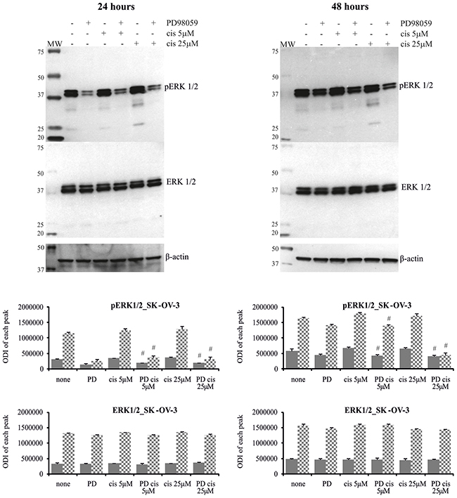 Figure 6: Phosphorylation of ERK1/2 in SK-OV-3 cells treated with MEK1/2 inhibitor and cisplatin. Cells were first treated with 50 μM PD98059 for 1 hour and then cultured with cisplatin at the concentrations of 5 μM or 25 μM for 24 or 48 hours or left untreated. Representative immunoblots of the ERK1/2 protein level and their phosphorylation are presented. Bands were quantified by densitometric analysis and data are presented as the optical density intensity (ODI) of the area under each band’s peak ± SD from 5 independent experiments. ERK1 – gray column and ERK2 - checkered column. Statistically significant decrease: #cisplatin + PD98059 vs. cisplatin, p≤0.05 (Wilcoxon’s signed-rank test).