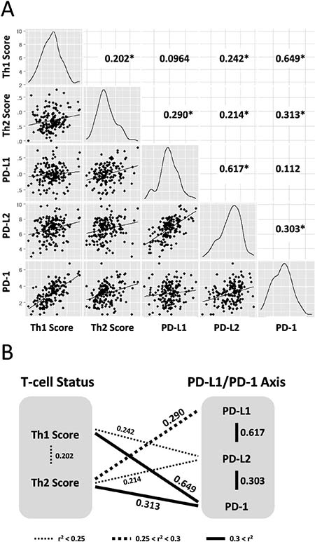 Figure 1: Th1 and Th2 helper T-cell scores are correlated to expression of PD-L1/PD-1 axis genes in 158 GBM training data set. (A) Density plots and correlation coefficient values (r2) are presented in scatter plot matrices. Targeting molecules for immunotherapy; CD274/PD-L1, PDCD1LG2/PD-L2, and PDCD1/PD-1. Numbers indicate correlation coefficient values (r2). Asterisk indicates statistically significant (*P < 0.05, log-rank test). (B) Schematic representation of correlation between Th1 and Th2 helper T-cell status and PD-L1/PD-1 axis genes. Correlations with statistical significances are drawn with thin dotted lines, thick dotted lines, and thick lines as weak (r2 < 0.25), moderate (0.25 < r2 < 0.3), and strong (r2 > 0.3) correlations, respectively. Data were derived from the scatter plot matrices.