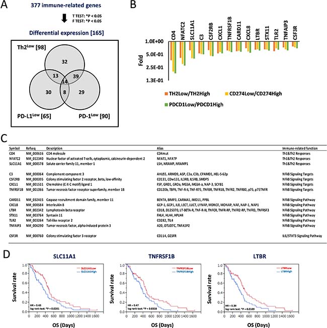 Figure 4: Decrease of signature genes for helper T-cell response and predominant inflammation signaling in Th2Low/PD-L1Low/PD-1Low estimates a good prognosis in patients with GBM. (A) Differential expression of immune-related genes estimates a good prognosis in patients with GBM. 377 immune-related genes were tested by t-test (*P < 0.05) and F-test (*P < 0.05), and 165 differential expression genes were identified, those expression were classified within Th2Low, PD-L1Low, and PD-1Low subgroups, compared with each High subgroup, respectively. Numbers in parentheses and Venn diagram are the gene numbers in the set and subset, respectively. (B) Differential expression of 14 genes in the Th2Low/PD-L1Low/PD-1Low subgroup. Fold differences of the gene expression in Low subgroups, compared with High subgroups, respectively, are shown in graph. (C) Characterization of 14 signature genes in Th2Low/PD-L1Low/PD-1Low. (D) Kaplan–Meier analysis for correlation between patient survivals and expression of SLC11A1 (left), TNFRSF1B (center), and LTBR (right). The 158 GBM samples were divided by median of each expression. HR indicates hazard ratio. *P < 0.05 with log-rank test is significant. OS, overall survival time (days).