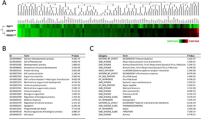 Figure 5: Decrease of gene expression in development, cell differentiation, immune response, and cell death in Th2Low GBM patients. (A) Decreased expression of 98 immune-related genes in Th2Low GBM patients, associated with expression in CD274Low and PDCD1Low GBM patients. Fold differences are shown in heatmap with clustering analysis. Color configuration indicates 0.057-fold (green) to 7.015-fold (red), compared with each High subgroup. (B) Gene ontology analysis of 98 immune-related genes decreased in the Th2Low subgroup. Representative GO terms with GOstat are presented. (C) Functional annotation of the immune-related genes decreased in Th2Low. Representative Terms with DAVIDv6.8 are presented.