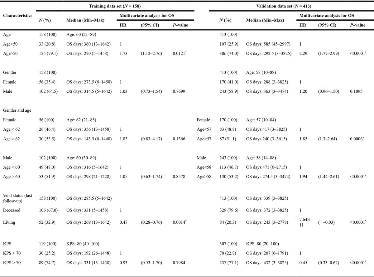 Note: OS; overall survival, HR; hazard ratio, KPS; Karnofsky performance status. Asterisks (*); statistically significant.