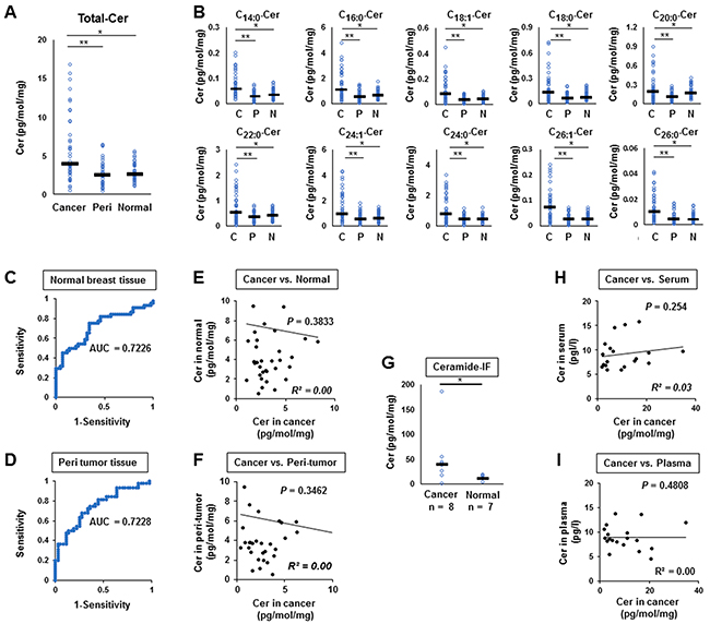 Patient characteristics were reported using the mean and standard deviation for continuous variables, and using frequencies and relative frequencies for categorical variables. The Mann-Whitney U-test and Student’s t-test for unpaired data were performed to compare differences between breast cancer tissue and normal tissue. The Kruskal Wallis H test for unpaired data was performed to compare differences among breast cancer tissue, peri-tumor tissue, and normal breast tissue. Receiver-operating characteristic (ROC) curves and the area under the ROC curve (AUC) were used to compare ceramide levels between cancer tissue and normal breast tissue as well as cancer tissue and peri-tumor tissue. All statistical evaluations were performed using the SPSS 16.0J software package (SPSS Japan, Tokyo, Japan). All tests were 2-sided and a P value of less than 0.05 was considered statistically significant.