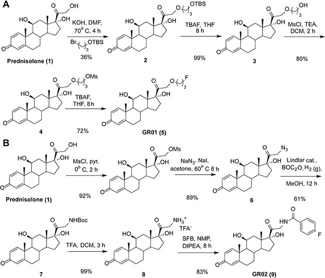 Figure 1: Synthesis of fluorinated ligands for GR. (A) A scheme outlining how GR01 was synthesized from prednisolone. 3-bromopropyl-tert-butyldimethylsilyl ether was appended to the C21 alcohol on prednisolone, and after silyl deprotection, the primary alcohol was activated for nucleophilic displacement with methanesulfonyl chloride. The resulting mesylate was displaced with a nucleophilic source of fluorine-19 to confer GR01. (B) A scheme showing how GR02 was synthesized from prednisolone. The C21 primary alcohol was activated for nucleophilic attack as a mesylate, converted to 21-aza-prednisolone via displacement with N3 anion, and subsequently reduced to a primary amine. The primary amine was coupled to 19F-SFB to confer GR02. Full synthetic details and characterization for 18/19F-GR01 and 18/19F-GR02 are available in the Supplementary Materials.