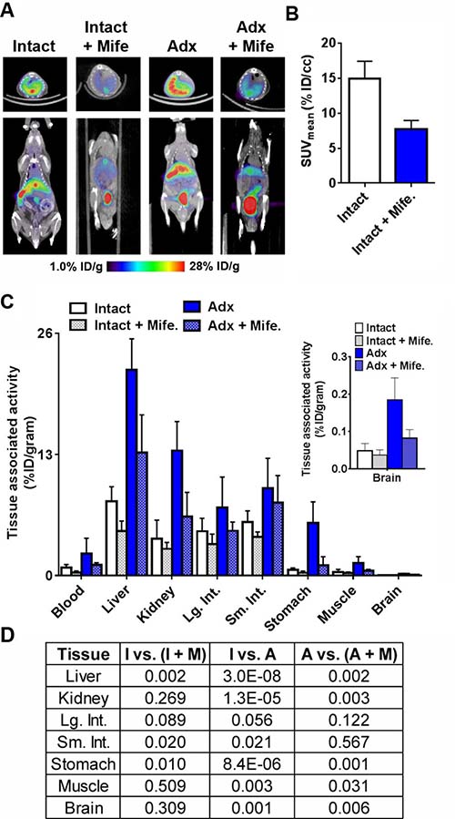 Figure 3: Evidence for the GR specific accumulation of 18F-GR02 in tumor naïve C57BL6/J mice. (A) Representative coronal and transaxial small animal PET/CT images showing 18F-GR02 accumulation in the abdominal tissues of tumor naïve intact or adx C57BL6/J mice (n = 5/treatment arm). Decay corrected images show that pretreatment of mife. via oral gavage (25 mg/kg) for four days prior to the injection of 18F-GR02 suppresses radiotracer uptake in the liver compared to treatment naïve intact or adx mice. Moreover, radiotracer uptake in the liver of adx mice without circulating corticosteroids is higher compared to levels in intact mice, consistent with a model by which 18F-GR02 accumulates in tissues due (in part) to direct GR binding in the ligand binding domain. All data were collected 60 minutes post injection of 18F-GR02. (B) Region of interest analysis shows that the suppression of 18F-GR02 uptake in the liver by mife. treatment is sufficiently large enough to be quantifiable using PET data. (C) Biodistribution data from select tissues showing the relative changes in 18F-GR02 accumulation in intact versus adx mice, and vehicle versus mife. treated mice. The levels in the brain are highlighted in the graphical inset, and the full biodistribution is reported in the Supplementary. (D) A grid representing the P values calculated for selected tissue to tissue comparisons between treatment arms. Statistically significant changes were interpreted to be P < 0.05. Abbreviations: I = intact, A = adrenalectomized, M = mifepristone, Lg. Int. = large intestine, Sm. Int. = small intestine.